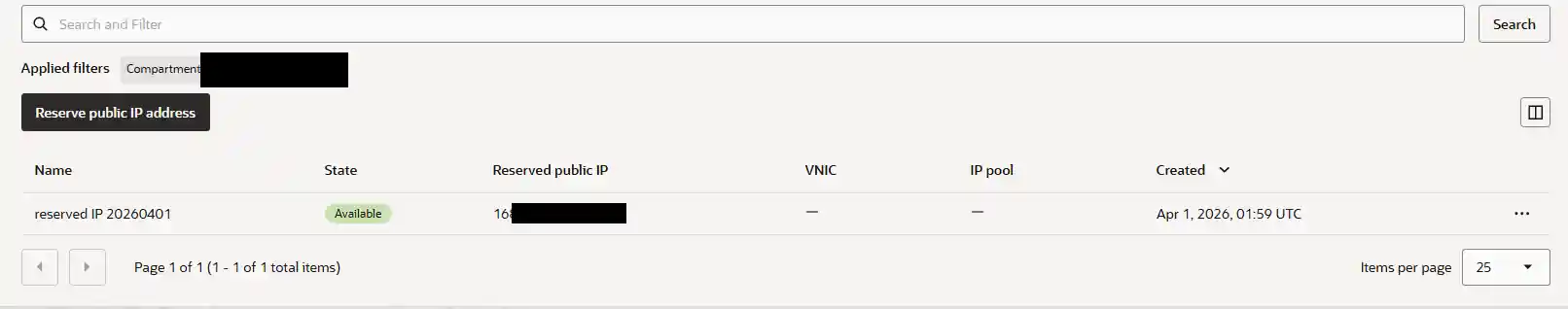 오라클 클라우드에서 고정 IP는 [Networking] > [Reserved public IPv4 addressese] 메뉴에서 관리한다.