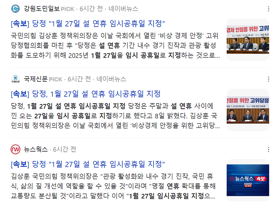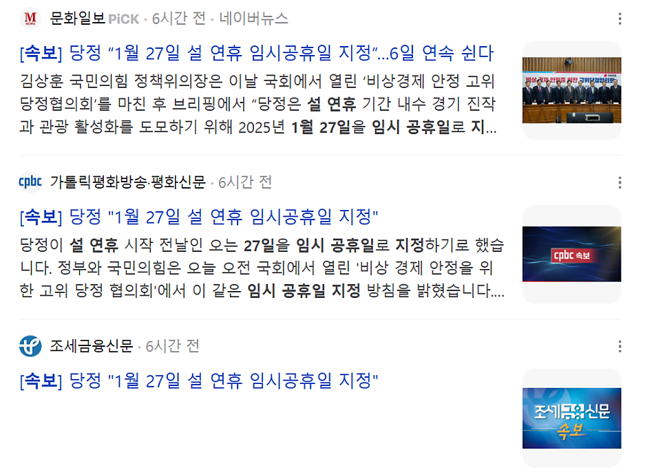 임시공휴일 속보를 살펴보면 1월 27일 설 연휴 임시공휴일 지정이라는 제목의 뉴스가 많이 만들어졌습니다.