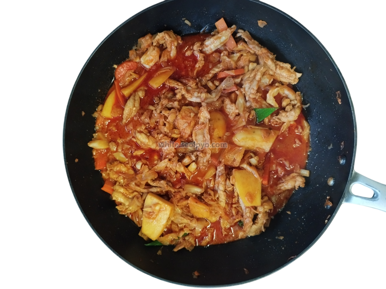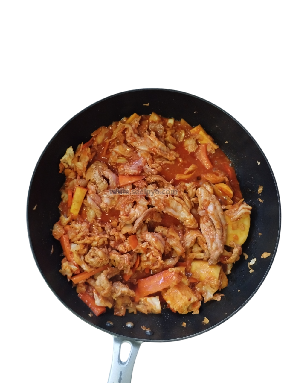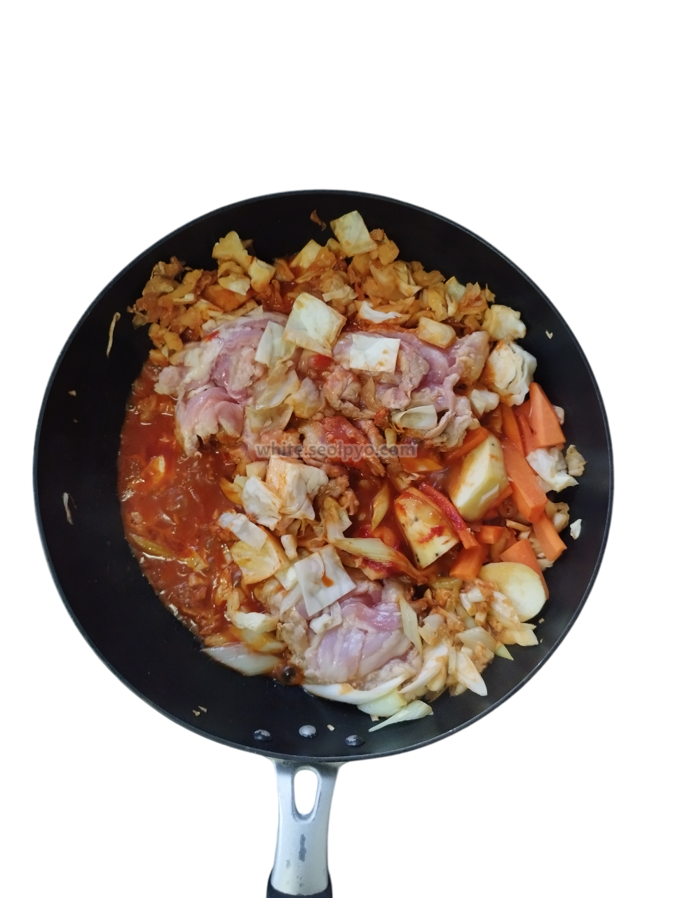 팬에 닭고기, 다진 양배추 또는 양파, 다진 대파, 적당히 큼직하게 자른 고구마와 당근을 넣는다.
