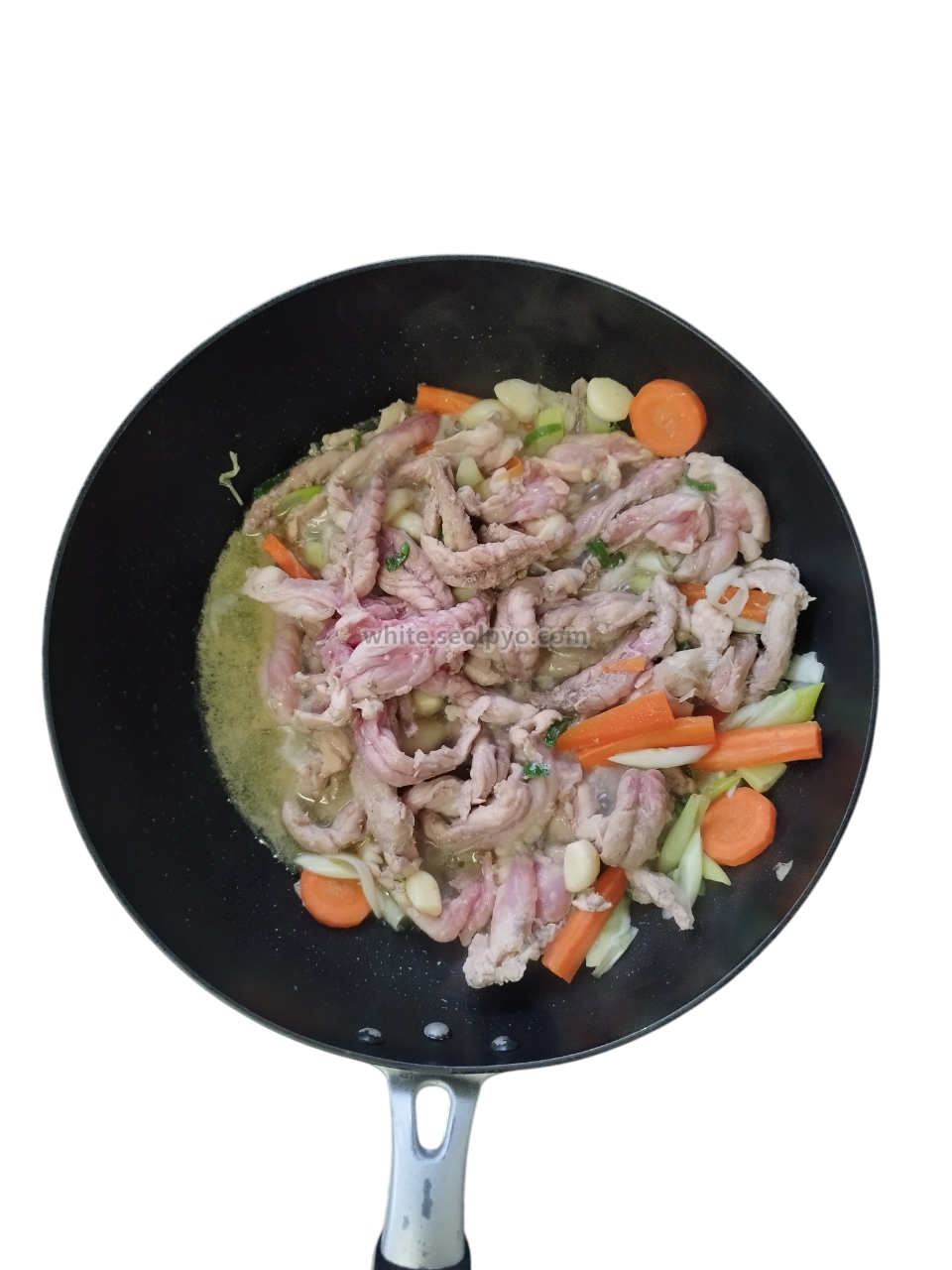 중불로 끓이다가 야채의 숨이 죽으며 국물이 생기면 강불에서 볶는다.