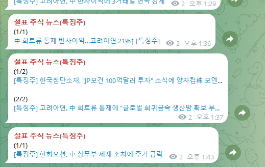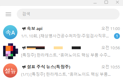 주식 뉴스 텔레그램 채널을 몇 개 이용해보았는데, 대부분 1분 또는 n분에 1회 알림이 갑니다.