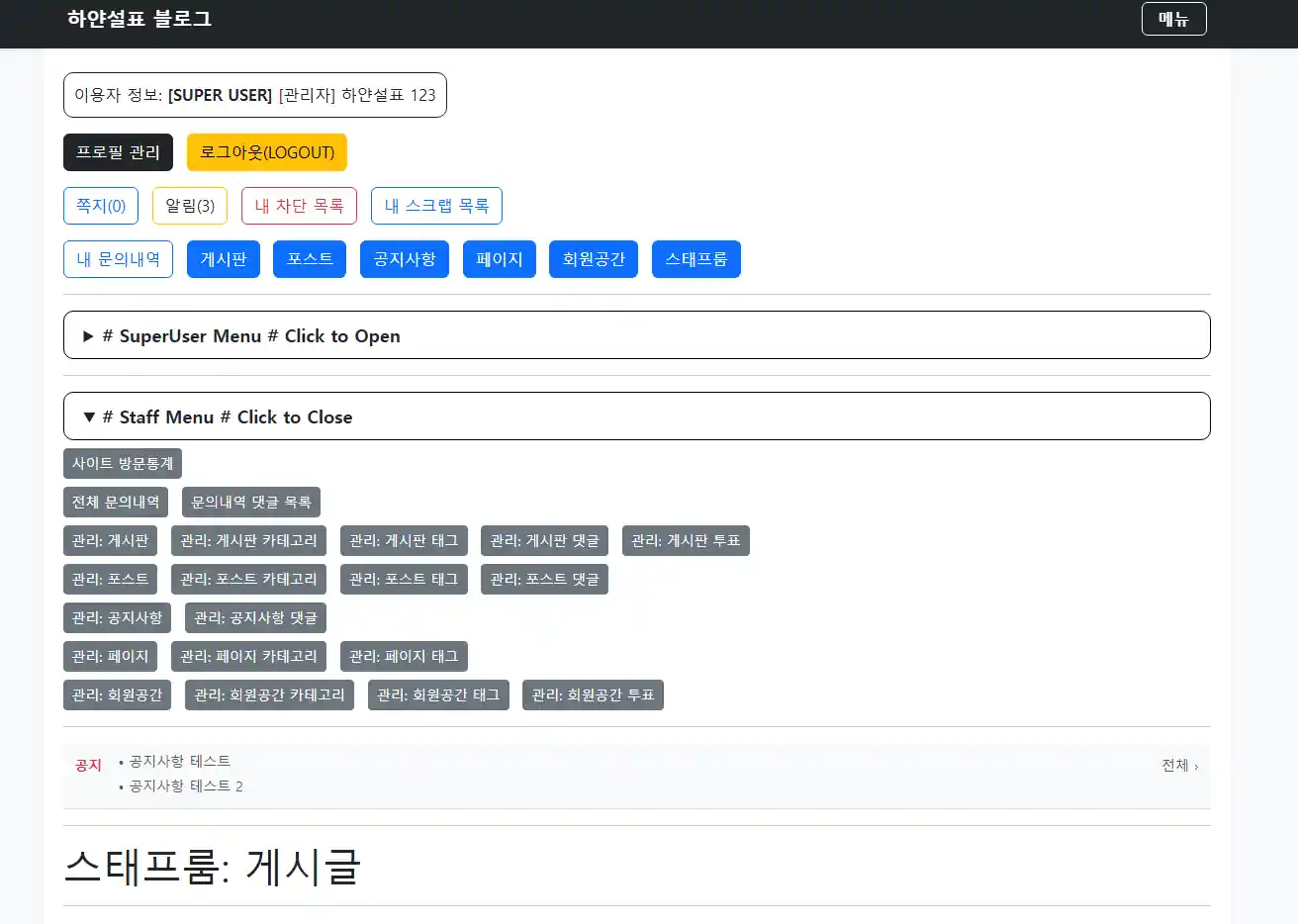 관리자 전용 게시판이나 익명 게시판, 특정 권한을 가진 회원만 접근 가능한 게시판 기능도 추가하고 싶은 욕심이 들긴 하는데.. 우선 코드 정리가 우선이다.