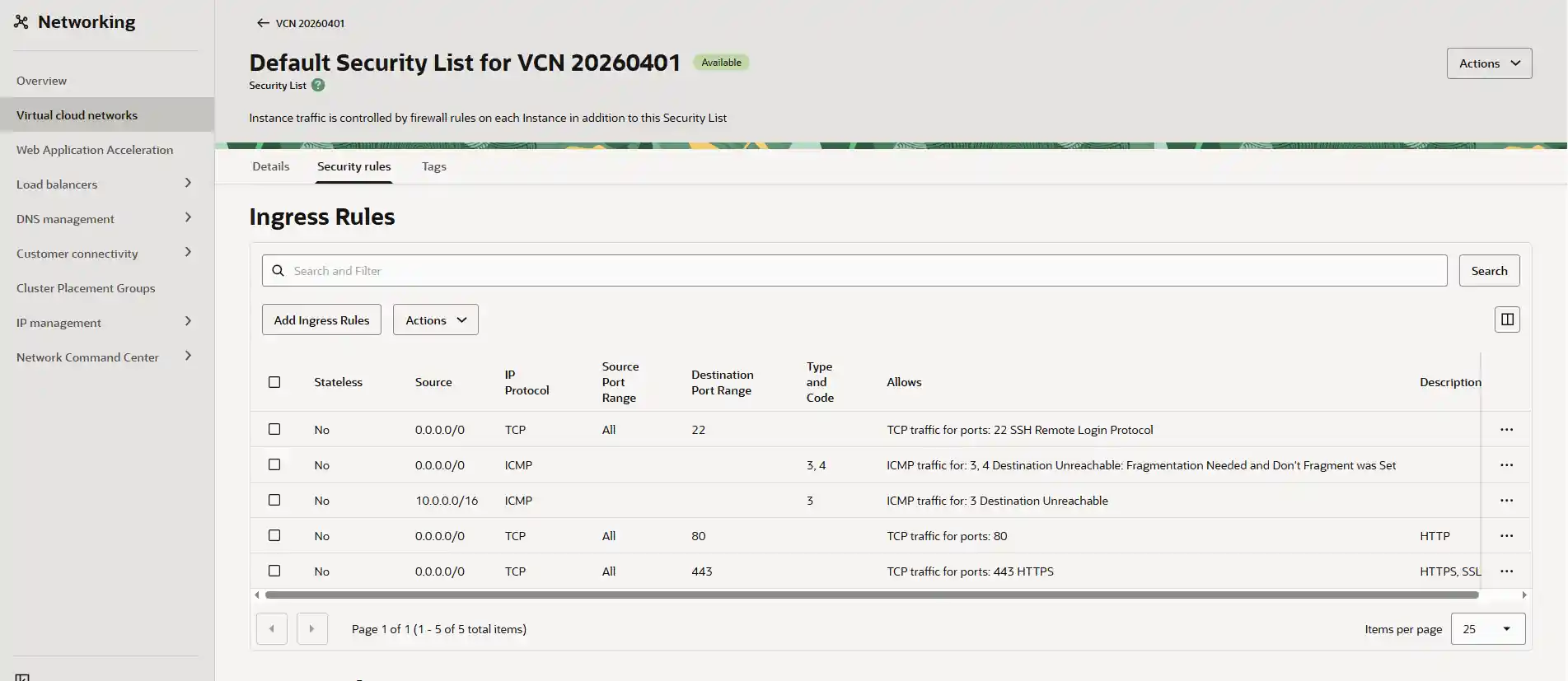 Security Lists에 연결된 기본 Security 속성을에서 Sucurity Rules 탭을 확인한다.